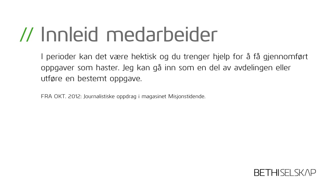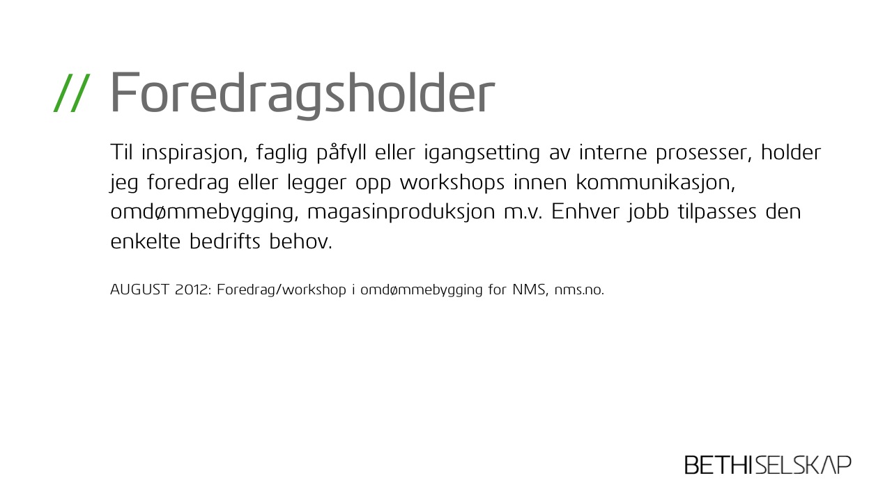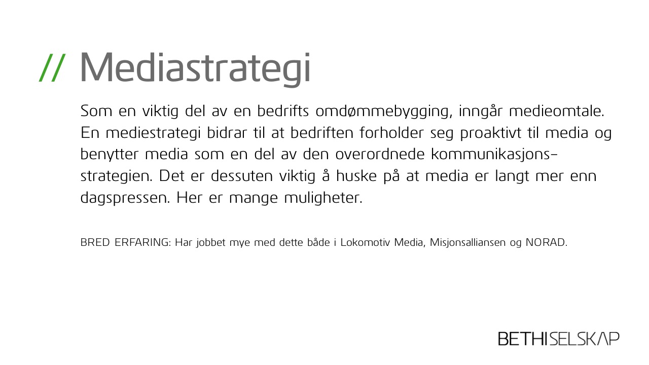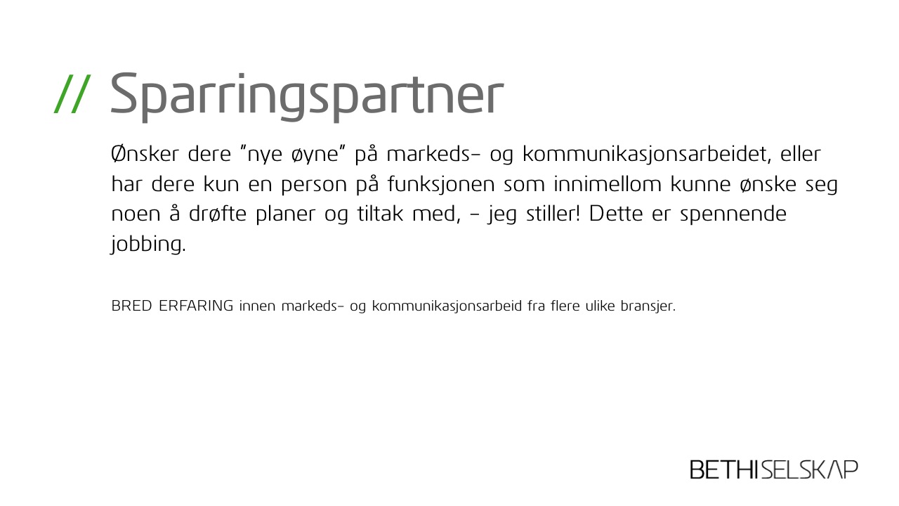 Jeg bidrar som sparringspartner eller gjennomfører innen omdømmebygging, kommunikasjon, markedsplanlegging o.l. Og jeg skriver alt fra redaksjonelle artikler til reklametekster. Har bred erfaring og stort engasjement!