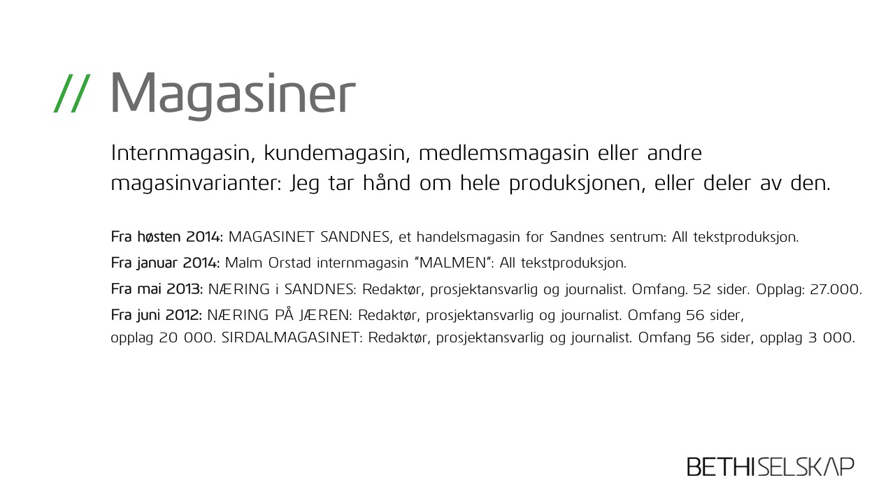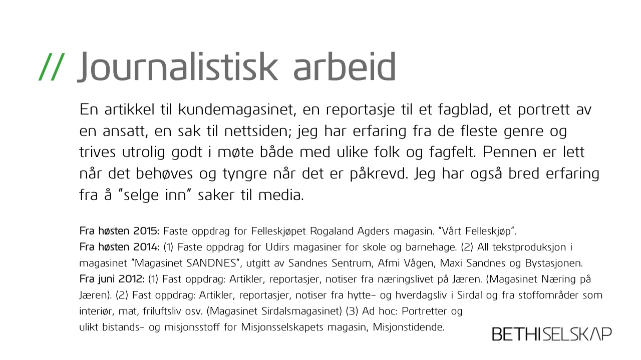 Etablerte mitt eget selskap våren 2012 der hovedaktiviteten har vært redaktør- og journalistjobben for magasinene Næring på Jæren, Næring i Sandnes og Sirdalmagasinet med til sammen 21 utgivelser i året. Jeg har også ervervet meg ny kunnskap innen sikkerhet og beredskap som konsulent i Proactima (2012-2015) med rollen som mediekoordinator. I tillegg har jeg utført ulike tekst- og journalistjobber for blant andre byråer som Dinamo PR, d10 og Lokomotiv Media , og har også bidratt med tekster til ulike internmagasiner, deriblant Malmen (Malm Orstad) og Vårt Felleskjøp (Felleskjøpet Rogaland Agder).